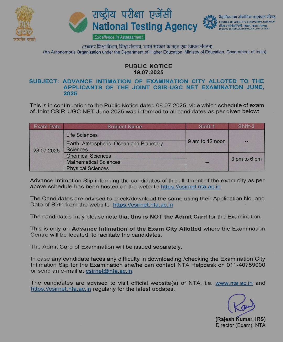 The National Testing Agency (NTA) has officially released the Advance Intimation Slip for the Joint CSIR-UGC NET June 2025 examination today, i.e. July 19, 2025. This slip informs candidates about the exam city allotted to them for the upcoming exam scheduled on 28 July 2025.